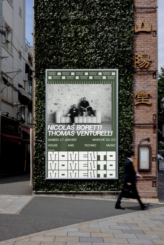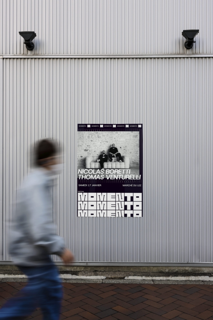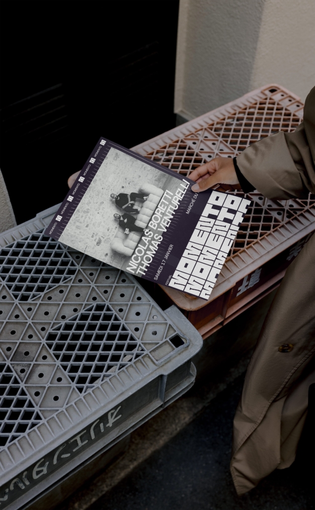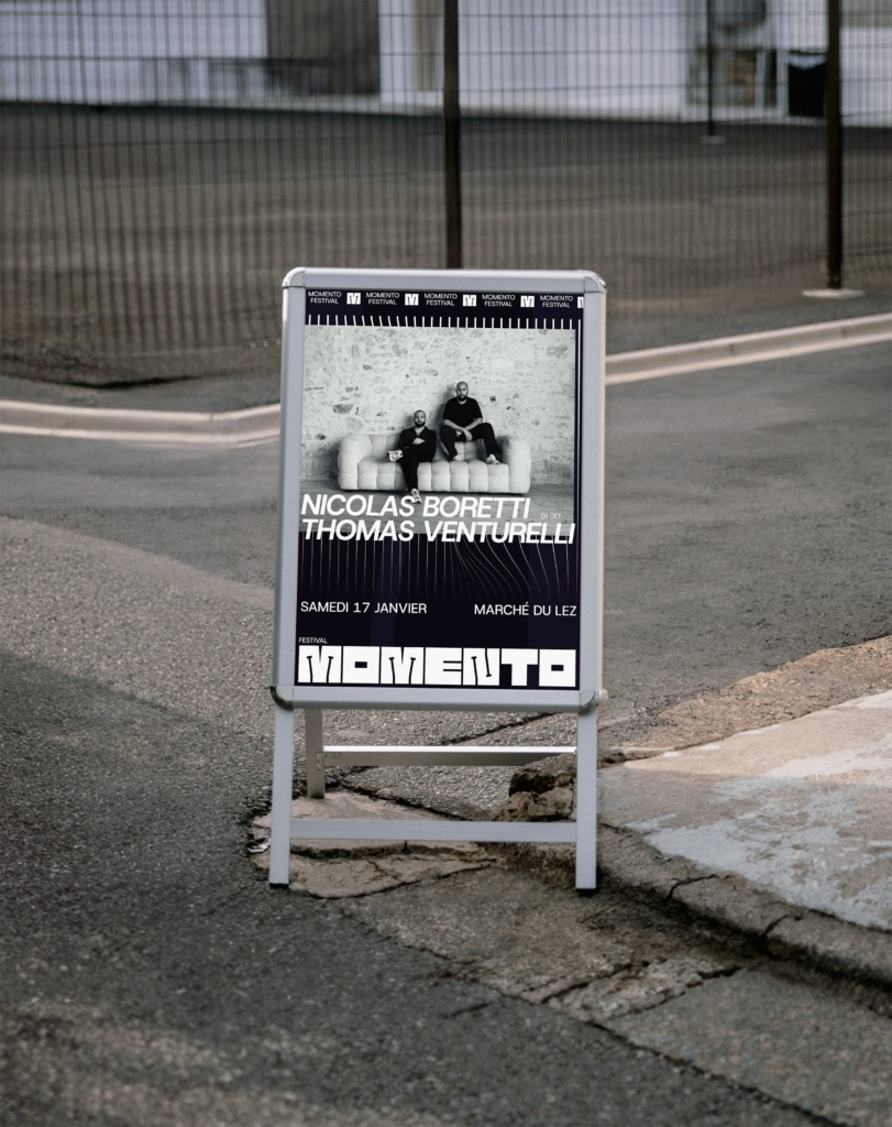 Tout commence à la rentrée de septembre, lors d’un échange convivial en extérieur, où Thomas et Nicolas me parlent de leur envie de franchir un cap. DJs depuis de nombreuses années, habitués aux scènes et aux événements musicaux, ils ressentent le besoin de donner naissance à un projet qui leur ressemble pleinement. De cette discussion naît MOMENTO, un concept d’événement porté par la musique et l’expérience du public, encore en quête d’une identité visuelle capable d’exprimer son caractère et sa singularité.